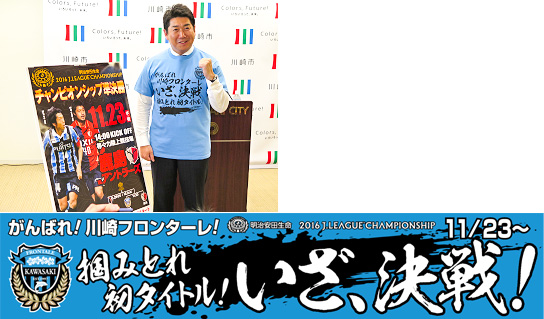 川崎フロンターレでは、11/23(水・祝)から始まる明治安田生命2016Jリーグチャンピオンシップに出場するにあたり、「いざ、決戦 掴みとれ初タイトル!」と銘打った企画を実施しますので、お知らせいたします。クラブ創立20周年の今シーズン、川崎フロンターレに関わる全員の力で、このチャンピオンシップを共に掴みとりましょう!企画の中には、サポーターの皆さんにもご協力いただきたい内容がございます。皆さんのご協力、何卒よろしくお願いいたします。