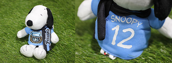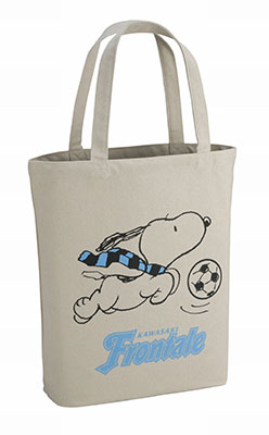 フロンターレカラーのマフラーをたなびかせ、ボールを追いかけるスヌーピーのデザインに、フロンターレロゴをレイアウトしたトートバッグ。