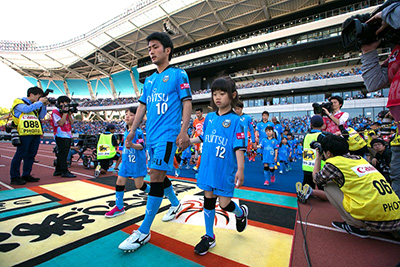 川崎フロンターレの公式戦(ホームゲーム)の際、両チーム選手と手をつないで入場(最大22名)、フラッグを持ちピッチに入場(最大14名)します。>