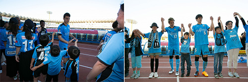 川崎フロンターレが勝利時、試合直後にピッチ横トラック上にて、選手とハイタッチをし、共に万歳三唱をします。