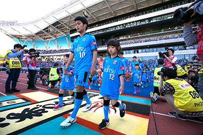 川崎フロンターレの公式戦(ホームゲーム)の際、両チーム選手と手をつないで入場(最大22名)、フラッグを持ちピッチに入場(最大14名)します。