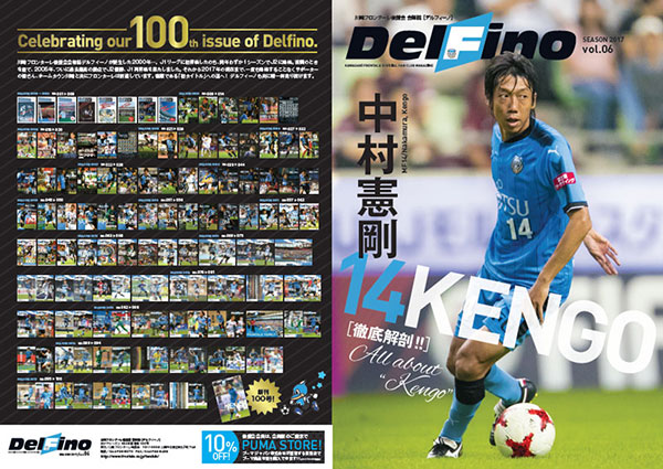 記念すべき通算100号となる今回は、フロンターレ一筋15年目、先日J1リーグ400試合出場を達成したケンゴこと中村憲剛選手が5年ぶりに第1特集に登場。第2特集では、過去のデルフィーノを選手、OBのコメントを交えながら一気に振り返ります。