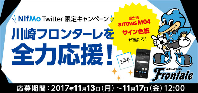NifMoのTwitter公式アカウント(@NifMo_Official)をフォローし、対象のツイートをリツイートすると、抽選で3名様に「好きなフロンターレ選手のサイン色紙(※1)」と「限定デザインタオルマフラー」、「NifMoお申し込みコード」のセットが当たります。