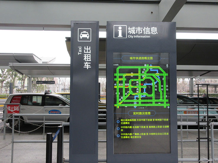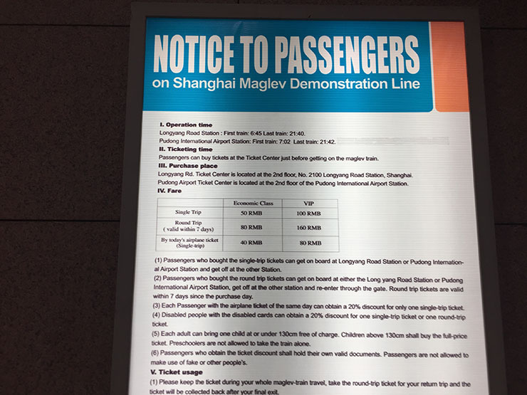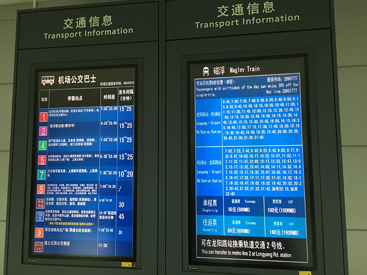 券売所で切符を購入。「龍陽路(Longhui Road)」まで7〜8分(時間帯により最高時速が異なる)、料金は片道50元(当日の航空券所持で片道40元)、往復80元、15分おきに運行。「龍陽路」からはタクシーがおすすめ。
