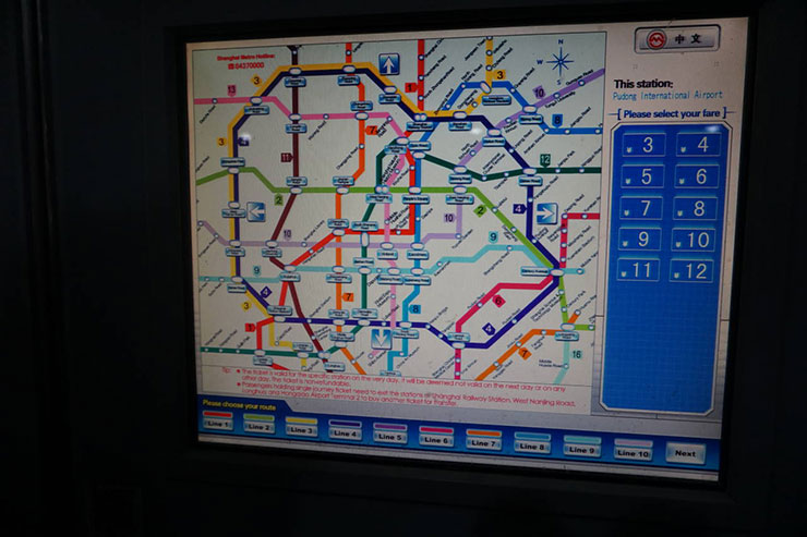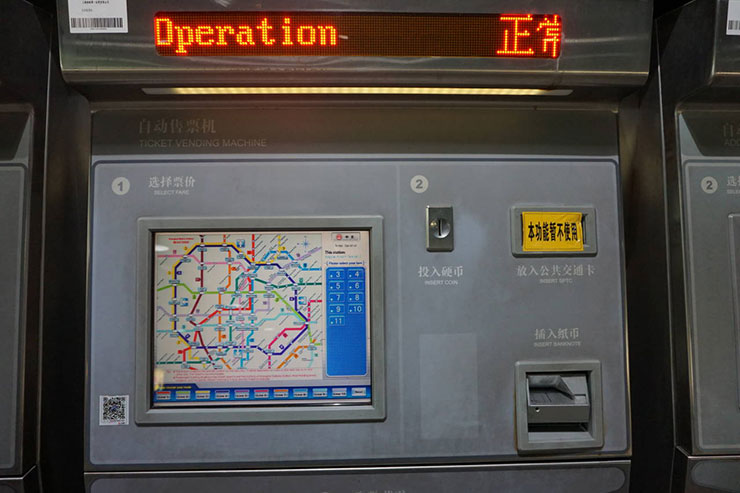 券売機で切符を購入。「広蘭路(Guanglan Road)」にて2号線を乗り継ぎ、「江蘇路(Jiangsu Road)」にて11号線に乗り換え