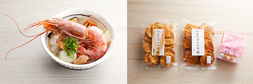 陸前高田のブランド米「たかたのゆめ」の米粉で作られたすいとんと大きな海老が入った具材は美味しさ満点!また、「たかたのゆめ」で作られた煎餅も香ばしさが口に広がってきます!!