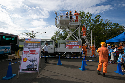 | 企画6 | ◆道路も線路も両方走る「架線整備車」乗車体験 道路と線路の両方を走れる架線整備車が昨年に引き続き登場します!電線の点検に使われるため、車体上部の作業台を上げ下げできる構造になっている特殊車両です。作業台からの迫力は必見です!
