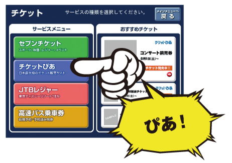 2.トップ画面から 「チケット」 → 「チケットぴあ」 → 「Pコードで探す」 の順に進む。