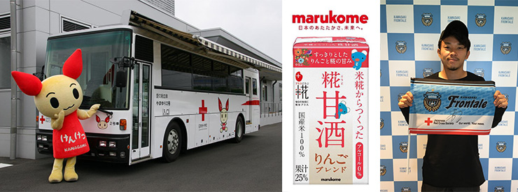 イベント当日、メインスタンド前広場にて献血にご協力いただける方を募集します。献血してくださった方には、マルコメの「糀甘酒(りんごブレンド)」をプレゼント。また「フロンターレ×赤十字コラボミニフラッグ」も差し上げます!こちらのフラッグ、運が良ければ選手直筆サイン入りが当たりますよ!