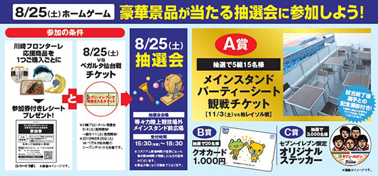 オフィシャル携帯サイト「モバイルフロンターレ」の会員の皆様限定で、豪華賞品が当たるプレゼント企画をホームゲーム全試合で実施。今年も豪華商品を用意。試合前に大型ビジョンに表示されるキーワードを入力して応募してください。ハーフタイム後まで申し込みが可能です。詳細はモバフロで!