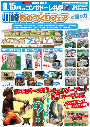 川崎フロンターレでは、川崎市経済労働局との共催で、川崎市の「ものづくり」の魅力を発信するイベント「川崎ものづくりフェアin等々力」を実施します。当日は「フロンターレ工房」と題して木材を活用した本格DIY体験「木工教室”FDIY”」やフロンパーク初となるチェンソーを使った木の彫刻「チェンソーアートパフォーマンス」をその場で行います!何が出来るかは当日のお楽しみ!是非、川崎の「ものづくり」を心ゆくまで楽しんでください!