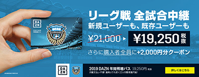 川崎フロンターレでは、DAZN年間視聴パスを販売しますのでお知らせいたします。ご加入者様全員に、アズーロ・ネロで使用できるお得な2,000円割引クーポンもプレゼント!この年間視聴パス購入金額の一部は強化費用として川崎フロンターレに還元されます!