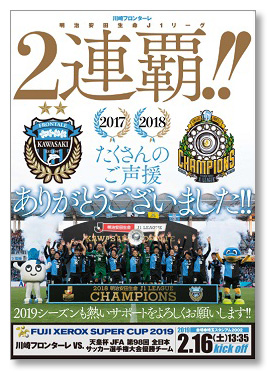 川崎市内の商店街やサポートショップの皆さんに掲示していただいている、ホームゲームの予定を伝える「スケジュールポスター」。一般に配布していない貴重なこのポスターの2019年1回目は「FUJI XEROX SUPER CUP 2019」スケジュールが記載されているポスターです。