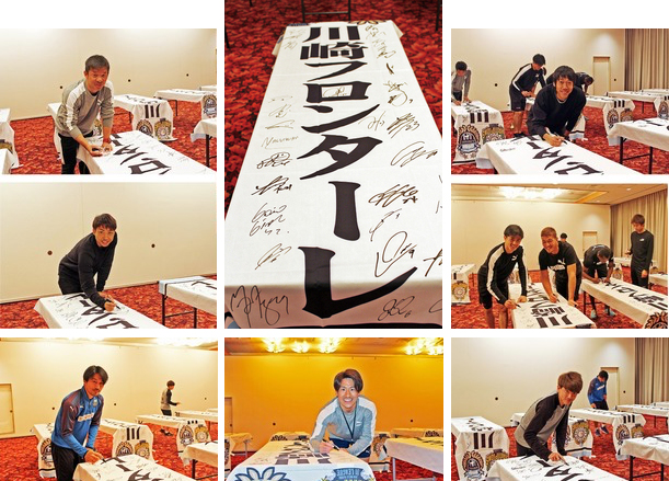 川崎フロンターレでは、2019シーズンに向けてのトレーニングキャンプを実施しておりました宿泊先である宮崎県綾町の「酒泉の杜」様のご厚意で、施設内に設置されていた2018シーズンの優勝ロゴが入った「のぼり旗」に、キャンプ参加の全選手のサインを入れてプレゼントすることとなりましたのでお知らせいたします。