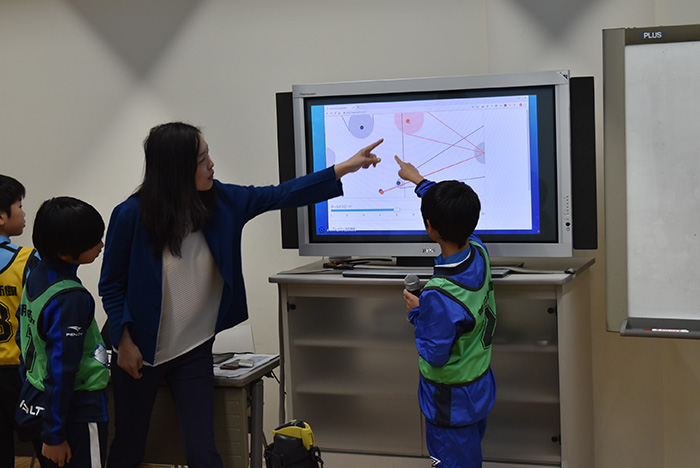 サッカーの基本でもあるボールの蹴り方を考え、実践するワークショップです。自分でボールを蹴る動きをセンサーで測定したり映像で撮影したりして可視化することによって、どうすればボールを強く速く遠くに蹴ることができるのかを考え、実践します。