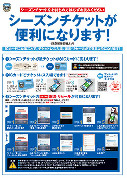 そのトライアルとして、2019シーズン後半戦(9月14日ジュビロ磐田戦)より、2019シーズンチケットをICカードにしますので、お知らせいたします。チケット電子化により、お客様によりよいサービスを提供し、転売対策にも積極的に取り組みます。