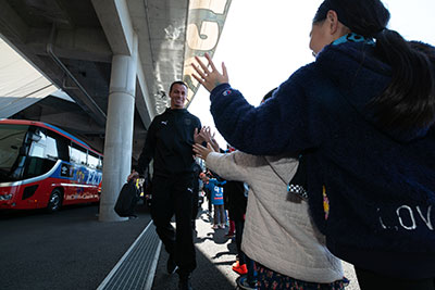 今シーズンから新しくなった選手バスでスタジアム入りする選手たちをハイタッチで迎えます。