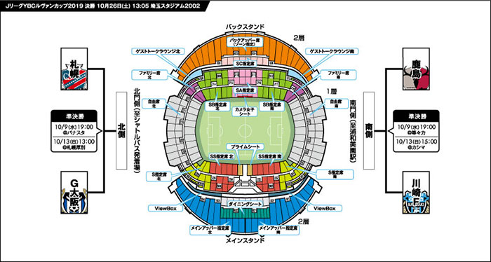 ※7月28日(日)に開催された「2019Jリーグ YBC ルヴァンカップ オープンドロー」の結果をもちまして、川崎フロンターレが決勝に進出した場合は「アウェイクラブ扱い」となります。メインスタンドから見て右側が川崎フロンターレの応援エリアとなります。