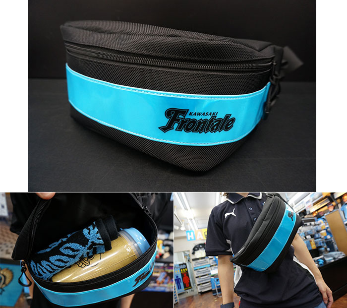 メインビジュアルは普段使いしやすいブラックに。中生地にはフロンターレブルーを使用しているのでさりげなくフロンターレアピールを!バッグをコンパクトに畳むことが出来るのでお土産など購入した物を入れるセカンドバッグとしてもオススメ。