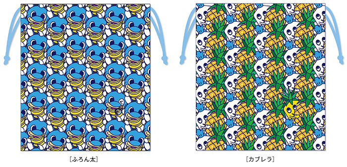 『ドールランド秋』開催を記念してフルーツ盛りだくさんの巾着を発売。ふろん太はバナナを!カブレラはパイナップルを持ったデザイン。あれ!?カブレラが黄色に…。