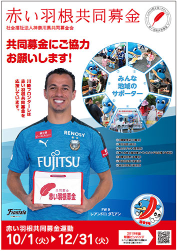 川崎フロンターレでは、社会福祉法人【神奈川県共同募金会】が本年度に実施する『赤い羽根共同募金』の川崎市内で行う募金運動に関して、今年度も協力することになりましたのでお知らせいたします。