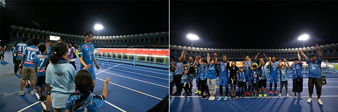 川崎フロンターレが勝利時、試合直後にピッチ横トラック上にて、選手とハイタッチをし、共に万歳三唱をします。