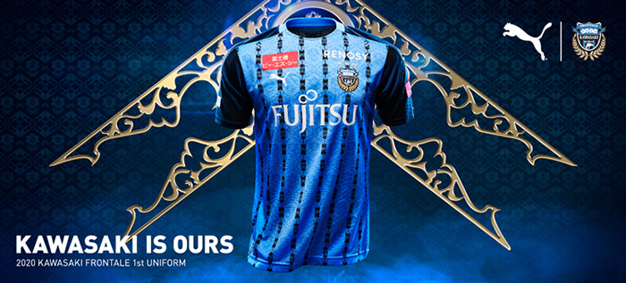 2020年の川崎フロンターレ1stユニフォームは、PUMAのグローバルデザインコンセプト“CRAFTED FROM CULTURE”に基づきホームタウンのカルチャーからインスピレーションを受けたデザイン。必勝祈願を行うホームタウン川崎を象徴する寺社からインスピレーションを受け、伝統的な川崎ブルーに縦のストライプと幾何学的にパターン化された飾り金具を模したデザインが施されています。