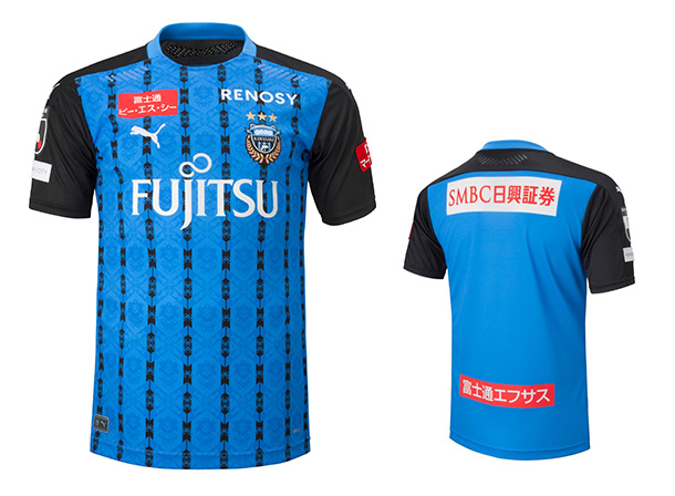 2020年の川崎フロンターレ1stユニフォームは、PUMAのグローバルデザインコンセプト“CRAFTED FROM CULTURE”に基づきホームタウンのカルチャーからインスピレーションを受けたデザイン。必勝祈願を行うホームタウン川崎を象徴する寺社からインスピレーションを受け、伝統的な川崎ブルーに縦のストライプと幾何学的にパターン化された飾り金具を模したデザインが施されています。