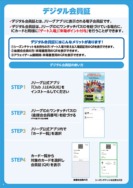 | 2020シーズンよりJリーグ公式アプリ「Club J.LEAGUE」にて、デジタル会員証が導入されます。後援会会員証(ICカード)と連動しておりますので、こちらをお使いいただければ後援会会員証(ICカード)の再発行は不要です。 |