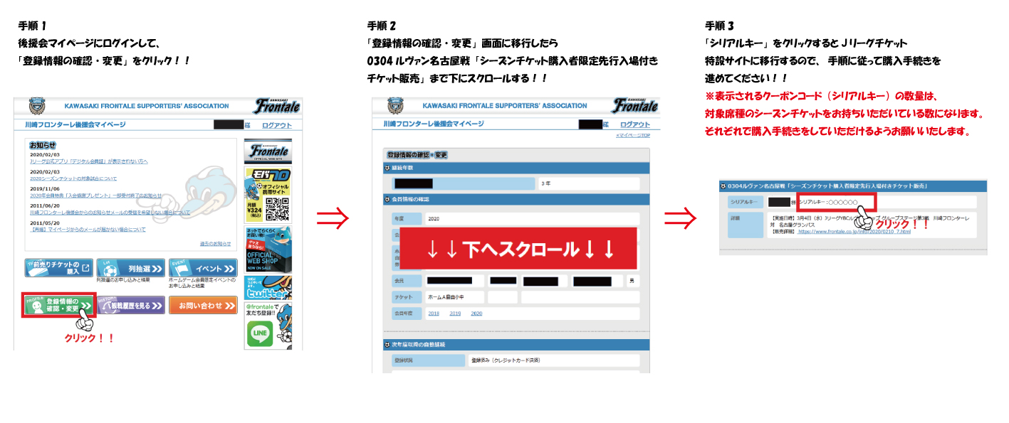 | 申込方法 | 販売開始時から、後援会マイページにログインいただき「登録情報の確認・変更」にシーズンチケット(自由席)購入者限定「先行入場チケット販売」に利用するクーポンコード(シリアルキー)が表示されるので、そちらをクリックして購入手続きを行ってください。表示されるクーポンコード(シリアルキー)の数量は、対象席種のシーズンチケットをお持ちいただいている数になります。(例:ファミリー会員4人のうち3人がシーズンチケットを持っている場合、表示されるクーポンコード(シリアルキー)は3つになります。大変お手数ですが購入もそれぞれのクーポンコード(シリアルキー)で行っていただけるようお願いいたします。) 【購入手順】 ![]() ※チケット価格以外の手数料は発生いたしません。 ※一度購入手続きを中断されるなどした場合は、通常のJリーグチケットの画面に移動してしまうので、再度購入手続きをする際は、マイページに表示されるクーポンコード(シリアルキー)をクリックし直して購入していただけるようお願いいたします。 ◇後援会マイページ登録済みの方 ご登録いただいたIDとパスワードでログインしてください。 ※1/23(土)13:00より後援会マイページでのログイン方法が変更となっております。手順についてはこちらを参照ください。 ◇後援会マイページ未登録の方 後援会マイページTOP画面より、「JリーグIDでログインする」を選択し「ご利用登録(無料)」から新規登録を行ってください。 ※フィーチャーフォン(携帯電話)でのご利用はできません。パソコン・スマートフォンからのお申し込みをお願いいたします。 |