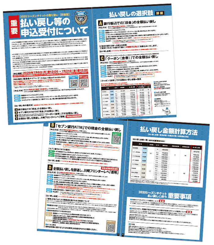 2020シーズンチケット払い戻し等の申込受付は、2020年7月6日(月)昼12:00~7月31日(金)昼12:00で実施いたします。詳細はパンフレットにまとめておりますので、必ずご確認の上、期間内に申込受付をお願いします。