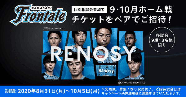 2020年10月5日(月)までにRENOSYの不動産投資個別相談会ご参加で、2020年9・10月の「川崎フロンターレ」ホーム試合(次の対象試合のいずれか)の観戦チケット(1組2名様)をプレゼントいたします。
