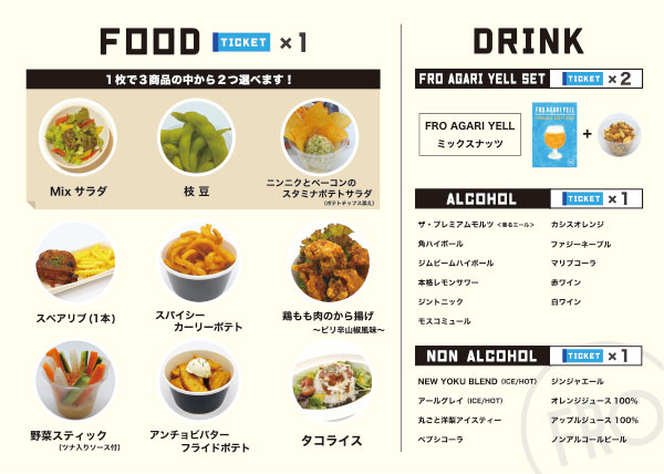 | 当日のご利用方法 | 店内でのご飲食代については食券でのお支払いとなります。 【食券:1枚/500円】※お一人様/最低2枚購入必須 ○メニュー