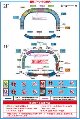 ※ビジターサポーターの横断幕掲出については、ビジターA指定のエリア内(1階席最前列、2階席最前列部分)のみ掲出可能といたします。掲出の際は係員の指示に従ってください。