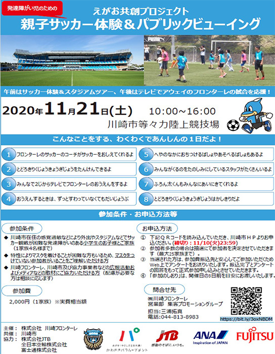 川崎フロンターレでは、発達障がいのある子どもたちのための「親子サッカー教室とパブリックビューイング」の参加者の募集をいたします。