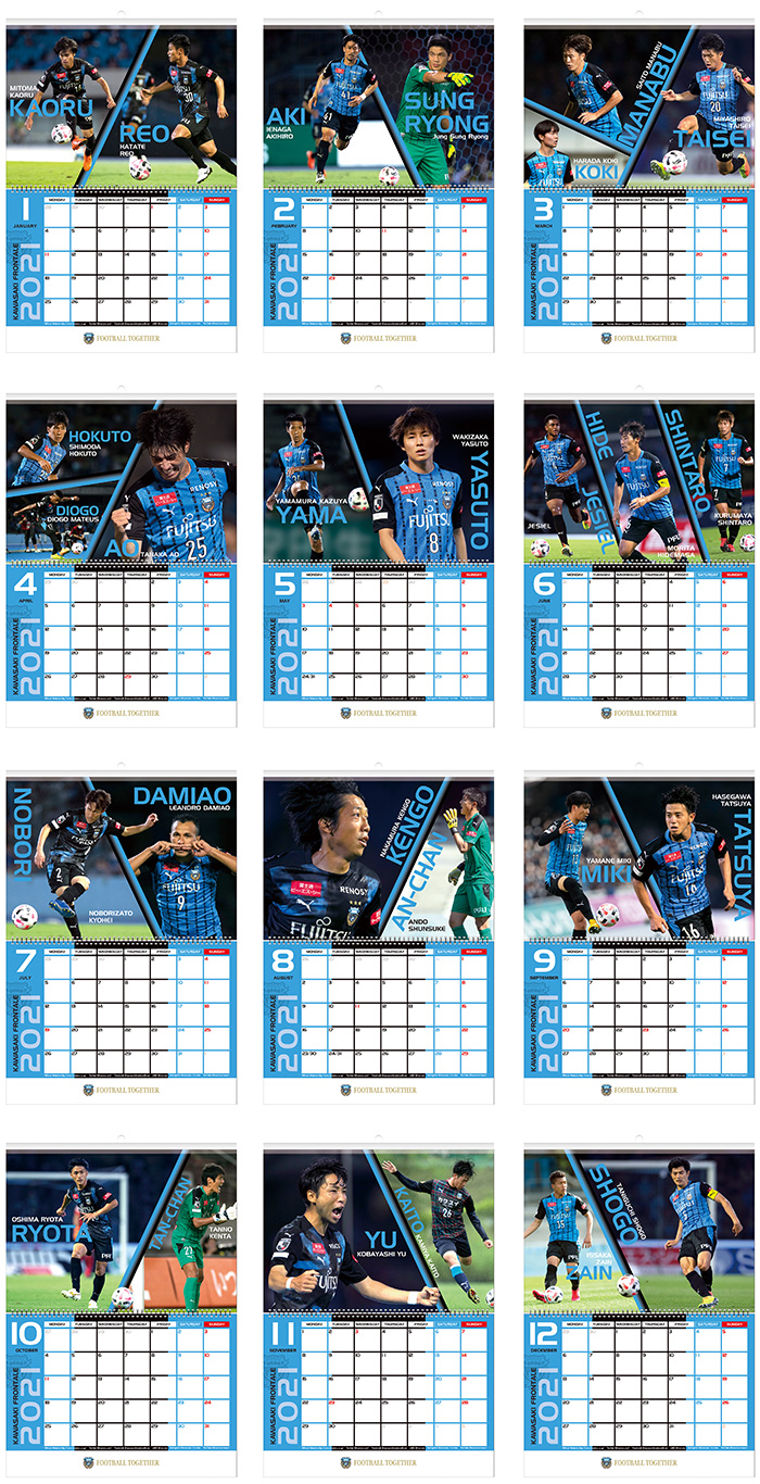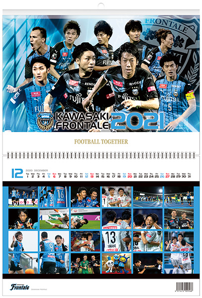 ピッチ上の選手たちの表情を中心に2020シーズン在籍(9月末時点)の全選手を掲載した壁掛けタイプのカレンダーになっています。