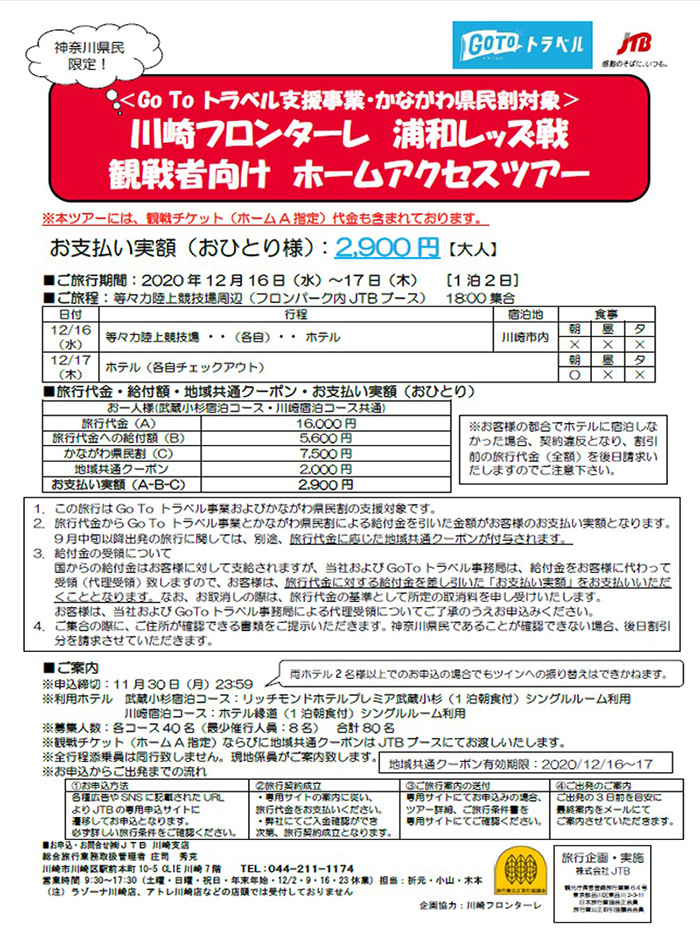 (株)JTB川崎支店では、「12月16日(水)vs浦和レッズ」の川崎フロンターレ・ホームツアーの参加者を募集いたします。今シーズンのホーム最終戦!皆様のお申込みをお待ちしております!