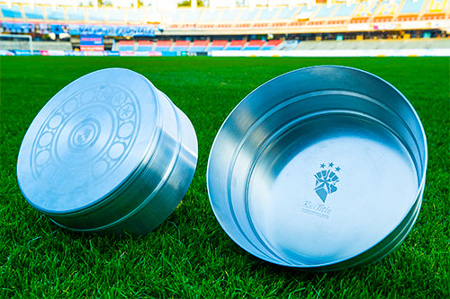 フロンターレにしかできない伝統に合わせた今回のフロ桶は、Re:titleの名のままに『奪還=奪缶(奪う缶)』をテーマに掲げて商品化。Made in KAWASAKI にこだわり、川崎市高津区に本社を構える「今野工業株式会社」様にご協力いただき、シャーレのように輝くアルミフロ(風呂)桶が完成。