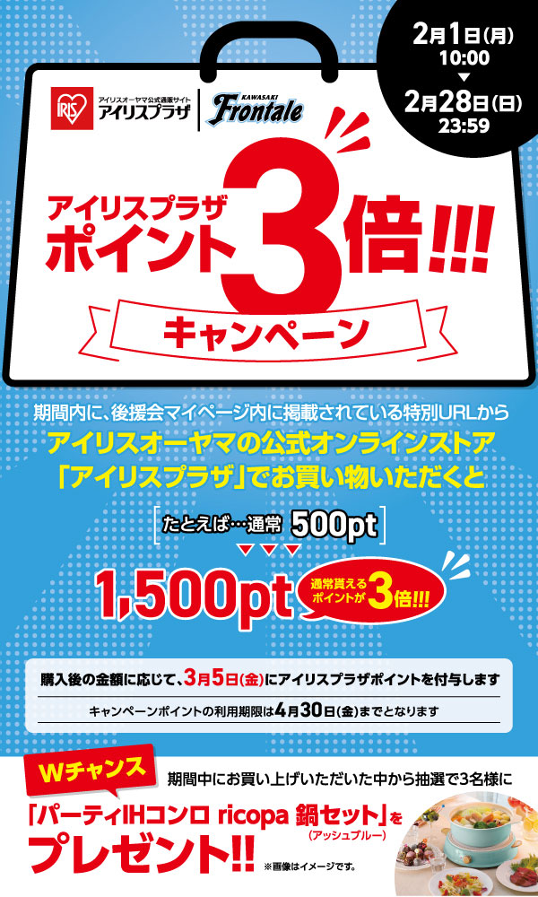 川崎フロンターレ公式ファンクラブ「川崎フロンターレ後援会」では、オフィシャルスポンサーの「アイリスオーヤマ株式会社」と2021シーズン後援会会員限定でコラボキャンペーンを実施しますので、お知らせいたします。後援会マイページ内に掲載されている特別URLから、アイリスオーヤマの公式オンラインストア「アイリスプラザ」でお買い物いただくと、購入後の金額に応じてアイリスプラザポイントが3倍に!!