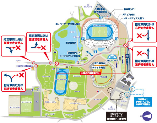 例)2/26横浜FM戦(18:00キックオフ)の場合、最大13:00~22:00頃まで車両の通行ができなくなりますのでご注意ください。