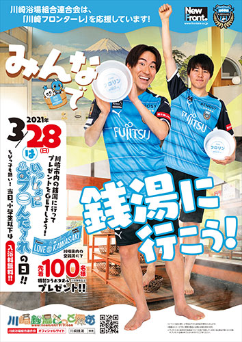 川崎フロンターレが地域貢献活動の一環として2010年にスタートした川崎市内銭湯の利用促進キャンペーン『いっしょにおフロんた〜れ』。今年は3月28日(日)が「お風呂の日」=「おフロんた〜れの日」です。当日は、川崎浴場組合連合会と川崎フロンターレのコラボタオルをプレゼントいたします。銭湯の楽しさをより多くの方に知っていただくと共に、川崎浴場組合連合会とホームタウン川崎を盛り上げます。