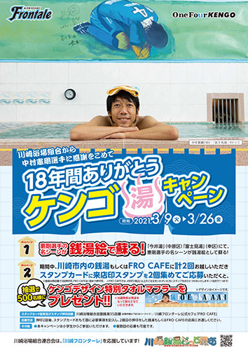 これまでの感謝の想い込めた「ケンゴ湯キャンペーン」を3月9日(サンキューケンゴ)~3月26日(さー風呂)まで実施します。サッカー選手としてこんなにも多くのおフロイベントに携わった選手は、ケンゴ以外いないはず。ぜひ、この機会にみんなで銭湯へ行きましょう!!