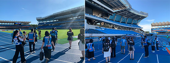 試合当日に陸上トラックを一周し、メインスタンド前で記念写真が撮れるツアーです。