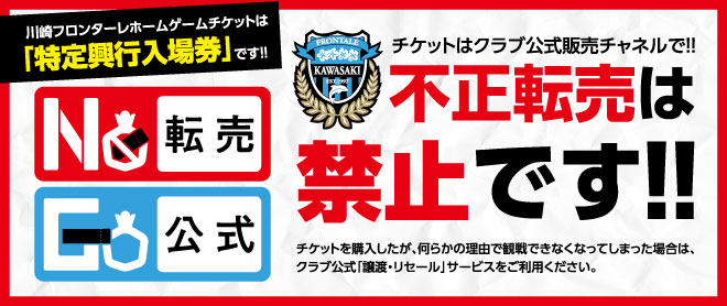 この試合のチケットは、購入者または入場資格者の氏名・連絡先を確認した上で販売し、「チケット不正転売禁止法」の対象となる「特定興行入場券」となります。 |