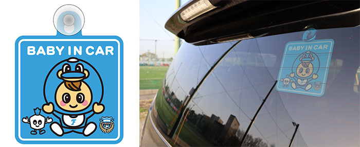 『フロンターレサポーターの赤ちゃんが乗ってます』という案内グッズ。安心・安全に車を運転してもらうお手伝いをフロンターレが行います!シールやマグネットのように車体に直接貼りたくないという方にオススメ。