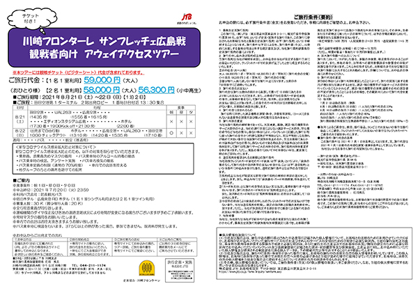 (株)JTB川崎支店では、「8月21日(土)vsサンフレッチェ広島」の川崎フロンターレ・アウェイアクセスツアーの参加者を募集いたします。夏休みのアウェイツアー!皆様のお申込みをお待ちしております!