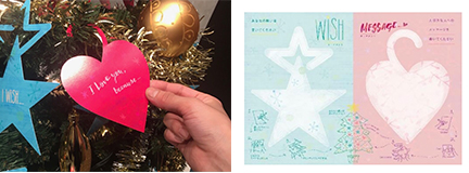 フィンランドのサンタクロースにメッセージと願いを届けましょう。 星型のカードには、「wish」あなたの願いを。ハート形のカードには、「I Love you,because」 大事な人にメッセージを。 今回、等々力競技場で皆さんの願いとメッセージを集めてツリーに飾り、「願いをかなえるクリスマスツリー」を作ります。皆さんが書いた願いとメッセージは、クリスマスが終わったら実際に、フィンランド・ロヴァニエミにいるサンタクロースの元に届けられます。 是非、ちょっぴり早いクリスマスをお楽しみください!
