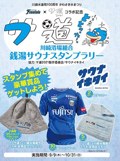 ドラマ「サ道」は芸人で俳優の原田泰造さん演じる主人公・ナカタアツロウとその仲間たちが繰り広げるヒューマンサウナドラマとして2019年にシーズン1が放送。現在毎週金曜深夜0時52分から新シーズンが放送されている人気ドラマです。サウナの主役は「水」風呂というつながりと、「サ道」からパワーをもらって「フ」ロンターレも「サ」ッカー道を極めようと、この度かわさき水まつりにて「フサ道ランド」としてコラボイベントを実施することになりました。当日は試合前からフサ道ランドでととのっちゃいましょう!
