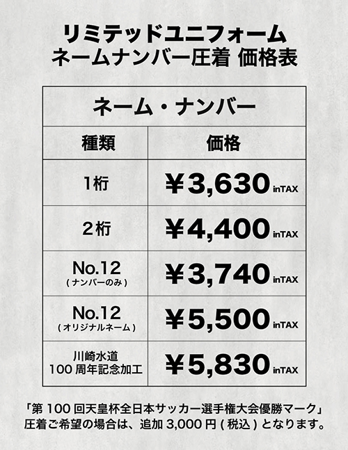 | 注意事項 | ※天皇杯優勝マークのみの受付も可能です。 ※Jリーグオンラインストアでの受付はありません。 ※加工位置の変更はできません。 |