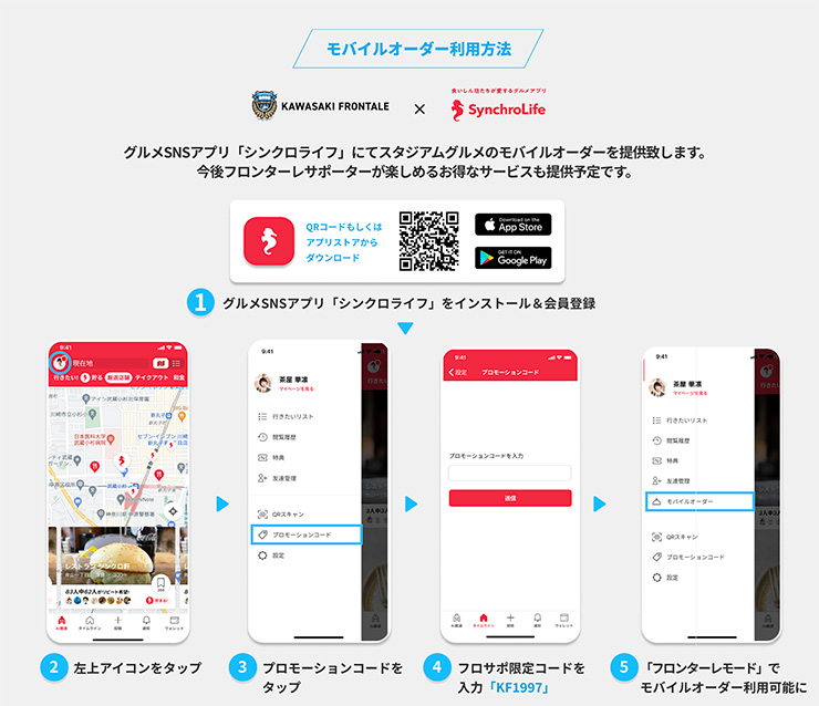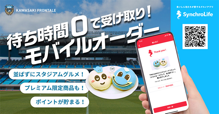 川崎フロンターレでは、2021年9月26日(日)湘南ベルマーレ戦から、食いしん坊たちが愛するグルメSNS『SyncroLife(シンクロライフ)』と連携し、アプリから事前注文でき、等々力陸上競技場で受け取れる「事前決済サービス」をスタートいたします。今後、等々力陸上競技場ホームゲームにおける各飲食店で発生している混雑を回避するために、「モバイルオーダーサービス」を活用することで、多くの皆さまに安心してスタジアムグルメをお楽しみいただけるようにしてまいります。
